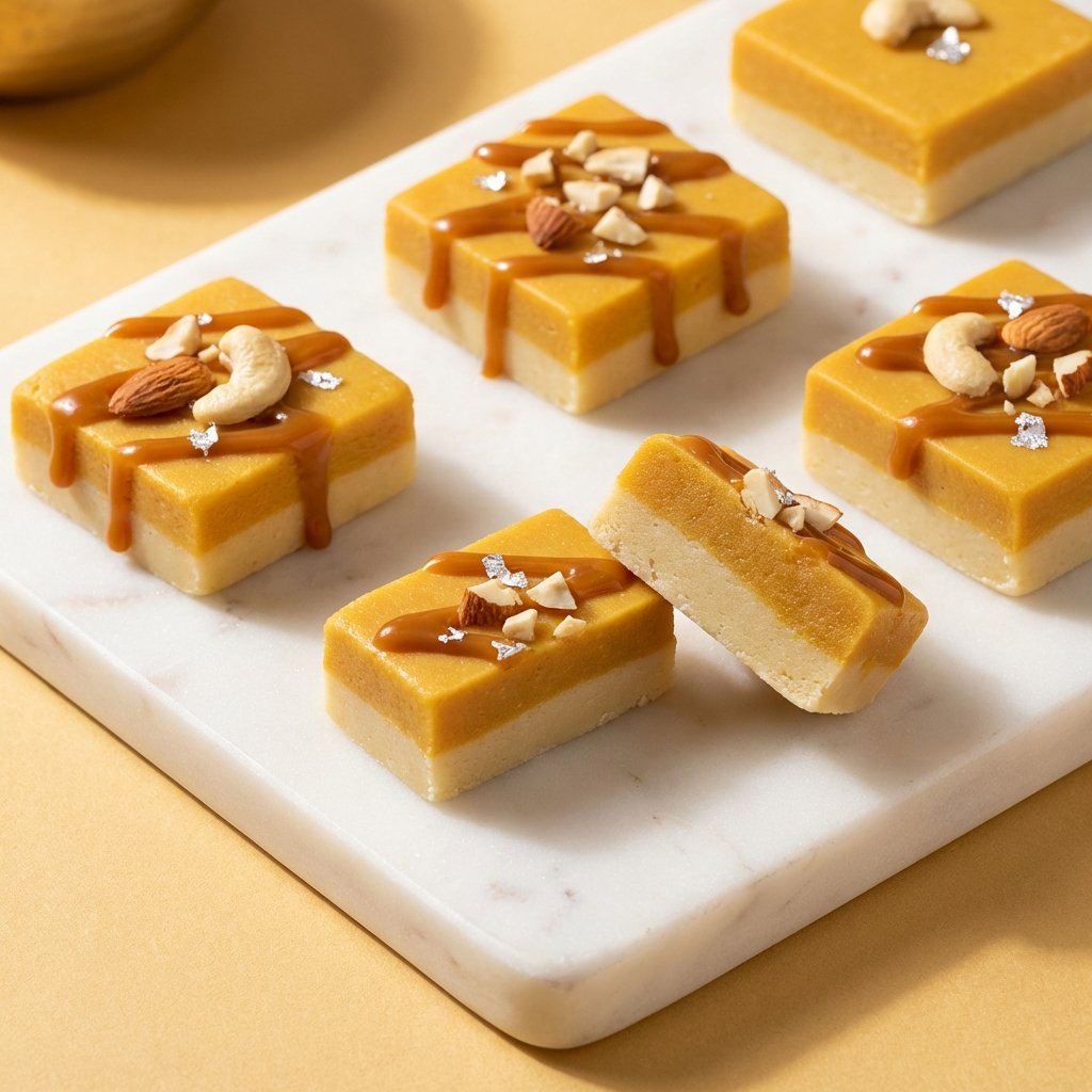 Butterscotch Barfi blends the creaminess of traditional barfi with the crunchy and flavorful taste of butterscotch. The soft base combined with light crunch creates a delightful texture and rich flavor experience.